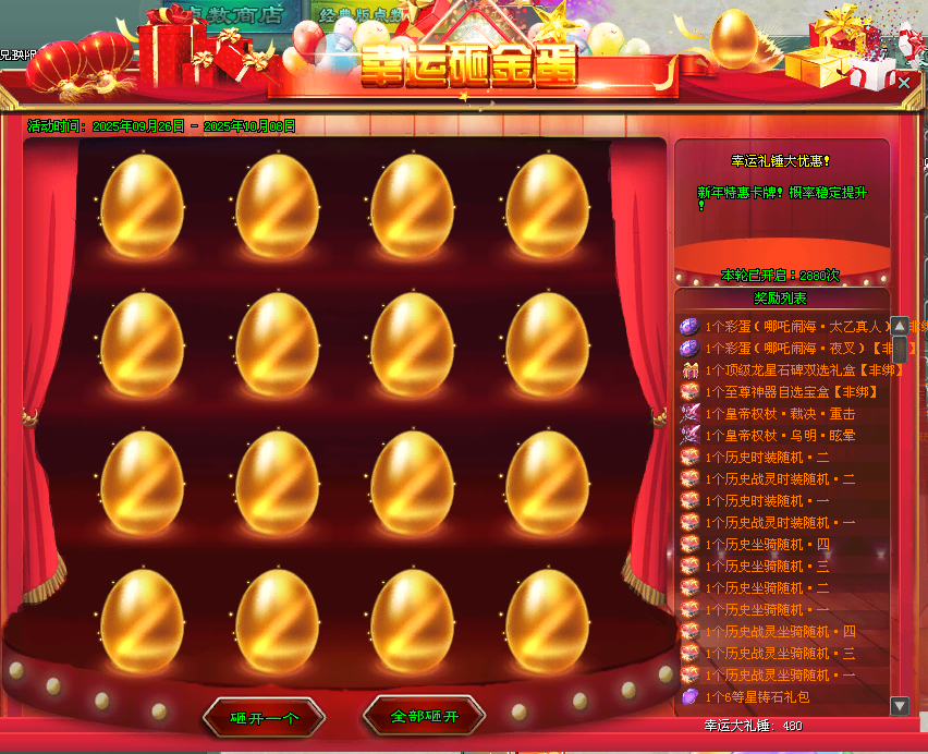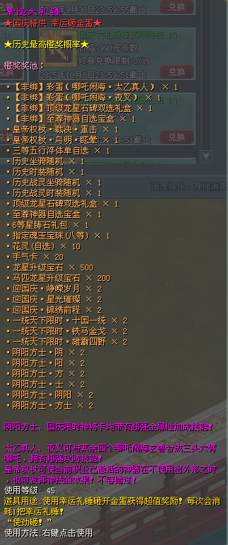 大礼锤砸金蛋,砸出超值豪礼!活动奖励含全新彩蛋(哪吒闹海·太乙真人)、彩蛋(哪吒闹海·夜叉)、顶级龙星石碑双选礼盒、至尊神器自选宝盒等珍稀奖励,机会难得,千万不要错过!