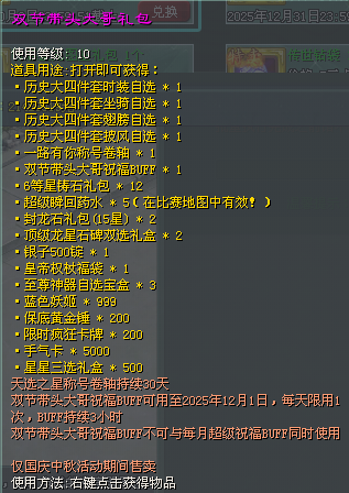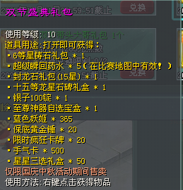 双节盛典礼包内含100锭银子、15星封龙石、15等龙星石碑等,仅限双节期间可购!