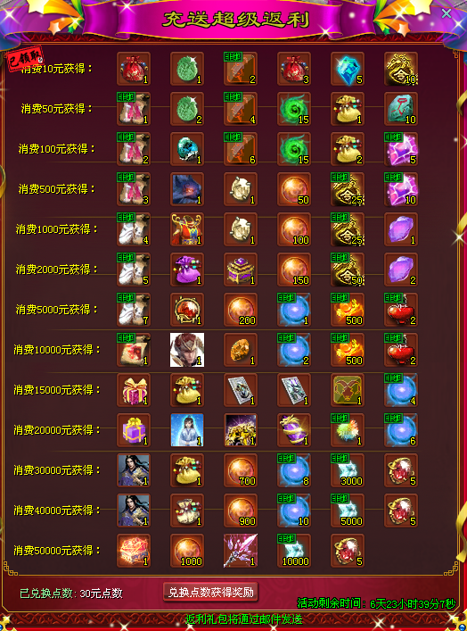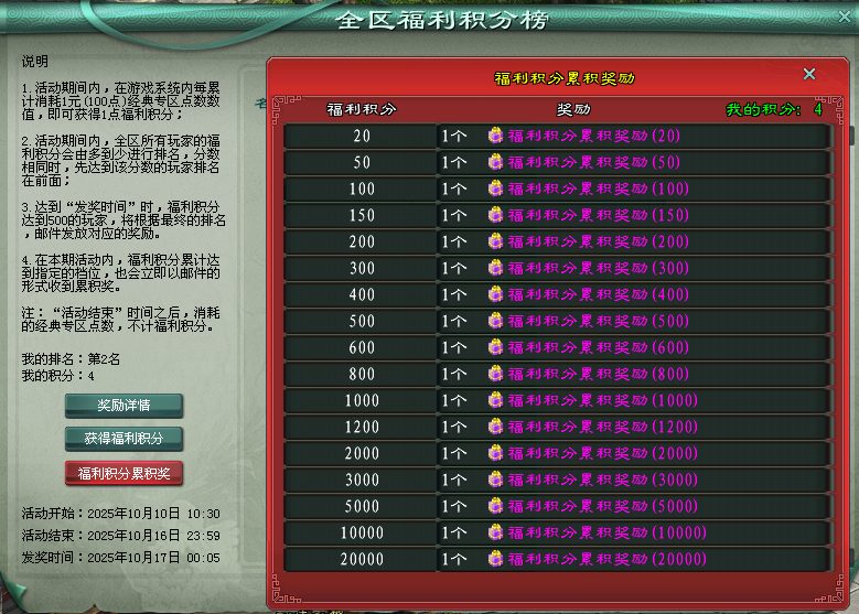 活动期间,游戏内每累计消耗1元(100点)经典版点数数值即可获得1点福利积分,达到指定积分、活动结束后根据积分排名,都可获得超值奖励!