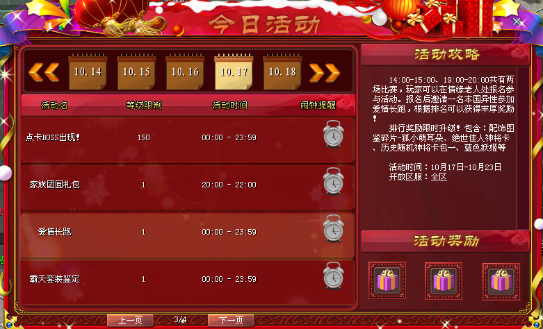 活动说明:活动当天晚上20:00-22:00期间,家族成员在线达到一定数量即可在22:00邮件获得相应的家族团圆礼包。在线人数越多礼包奖励越丰厚,千万不要错过!