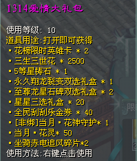 三生三世花特供大礼包【打开可获历史花榜神将卡十全十美包、花榜限时英雄美人卡、三生三世花、特惠龙星石碑双选礼盒、手气卡、马匹霸天令、龙涎丹、至尊礼券、【非绑】神器长生碎片、【非绑】花灵(自选)】