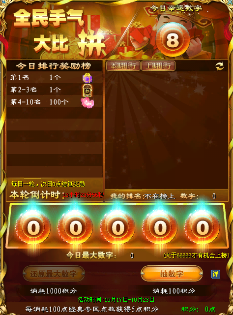玩家每消耗100点经典版点数可获得5点活动积分,使用积分进行抽奖,从个位开始计算,与当日幸运数字相同时将获得三生三世花奖励,与当日幸运数字相同越多获得的奖励越多。
