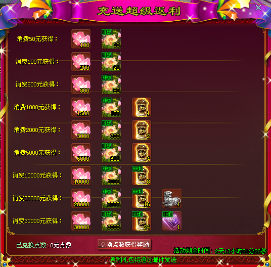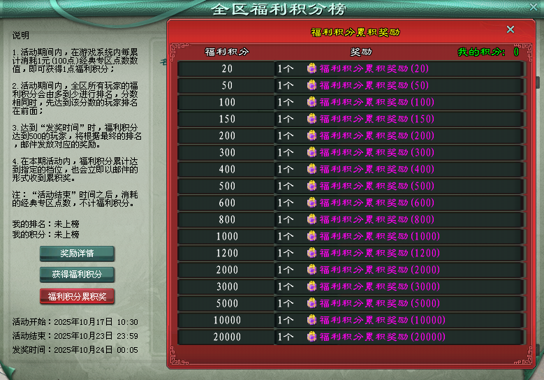 活动期间,游戏内每累计消耗1元(100点)经典版点数数值即可获得1点福利积分,达到指定积分、活动结束后根据积分排名,都可获得超值奖励!