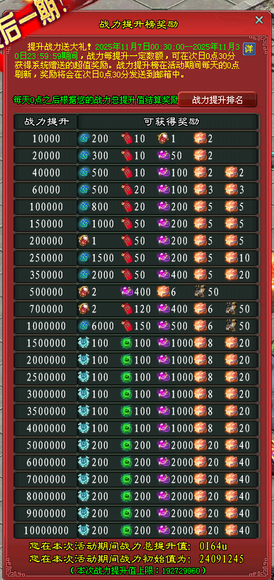 3、活动期间,以活动第一天个人战力榜上的战力作为基础,角色战力每提升一定数额,即可在次日0点30分获得系统赠送的战力提升奖励,奖励会以邮件形式(2天时效)发送;