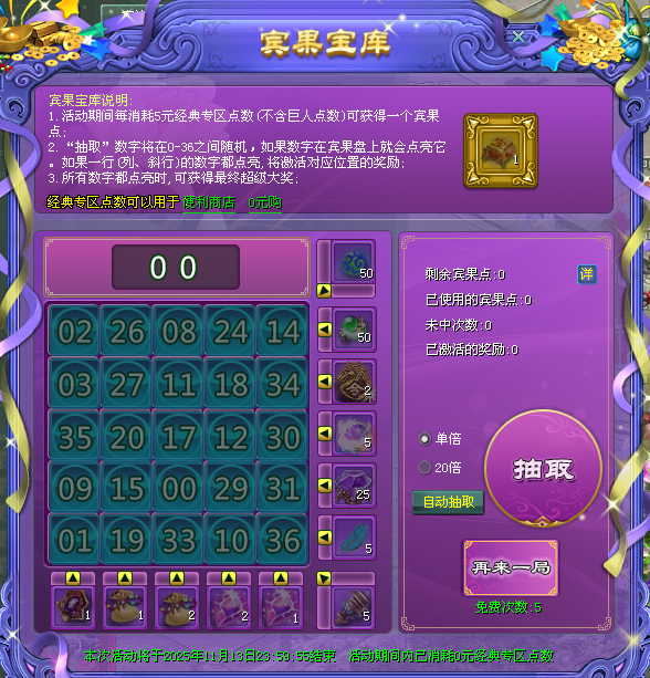 宾果宝库点亮数字形成一条直线(或对角线)即可领取对应奖励,点亮全部数字即可获得超级丰厚大奖——宾果宝盒!你今天的运气如何,还不快来宾果宝库试一下,今天最幸运的人,也许就是你哦!