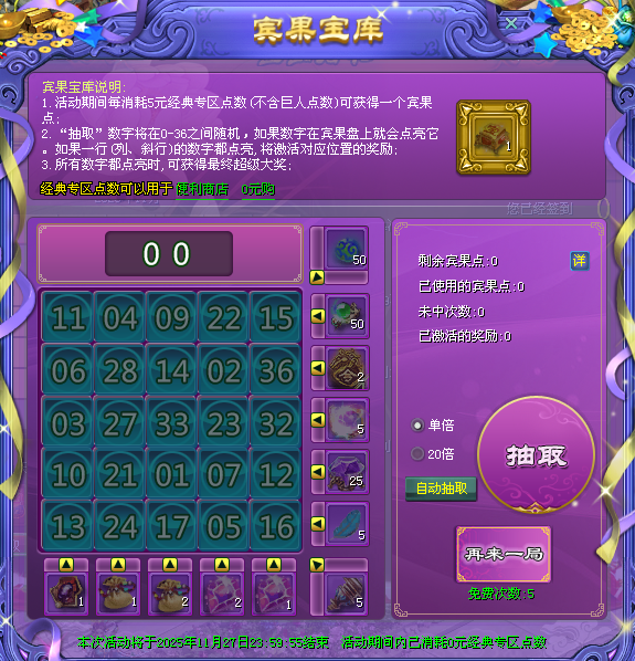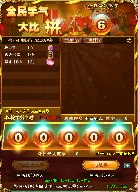 玩家每消耗100点经典版点数可获得5点活动积分,使用积分进行抽奖,从个位开始计算,与当日幸运数字相同时将获得三生三世花奖励,与当日幸运数字相同越多获得的奖励越多。