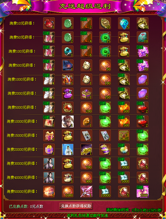 消费指定金额,三生三世花、非绑自选花灵、不死之力、战灵技能书特效单攻等大量珍稀奖励免费送,买得越多送的越多,千万不要错过!