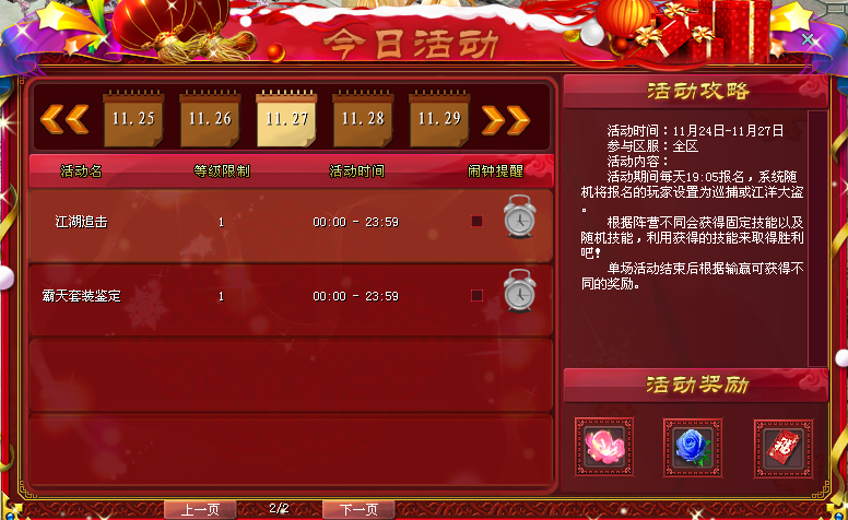 活动说明:活动当天晚上20:00-22:00期间,家族成员在线达到一定数量即可在22:00邮件获得相应的家族团圆礼包。在线人数越多礼包奖励越丰厚,千万不要错过!