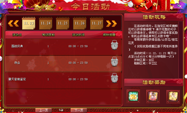 活动期间,每天19:00-19:45,在中立区将会出现一大片“玫瑰花丛”,玩家通过摘玫瑰可随机获得诗文的上下句(不绑定,可交易),凑齐同一篇诗文的上下句即可合成完整的诗文(右键点击合成),使用诗书即可随机获得诗会专属奖励!更有机会获得经典专区点数卡!