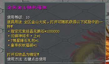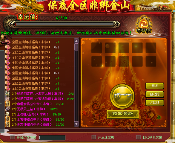 参与非绑金山有机会获得非绑全区金山随机福袋!每参与1次金山可累积1点幸运值,提升橙色大奖几率,如累积满500次未获得,可直接进入时光商店,如500幸运值内获得橙色大奖则幸运值清空,保底金山,保你中大奖!