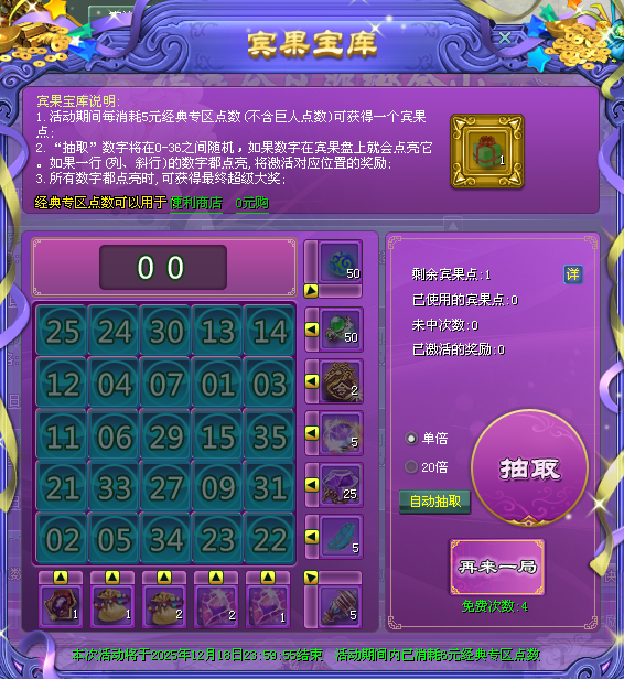 宾果宝库点亮数字形成一条直线(或对角线)即可领取对应奖励,点亮全部数字即可获得超级丰厚大奖——双12·宾果宝盒!你今天的运气如何,还不快来宾果宝库试一下,今天最幸运的人,也许就是你哦!