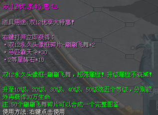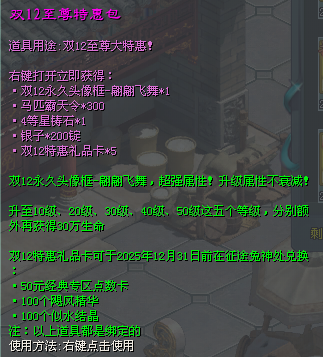 使用可获得双12永久头像框-翩翩飞舞、马匹霸天令、4等星铸石、银子200锭、双12特惠礼品卡