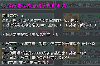 龙神套增伤BUFF礼盒,BUFF使用后可在365天内提升龙神套装伤害200000点,额外赠送超级老史祝福特惠礼盒兑换券*8