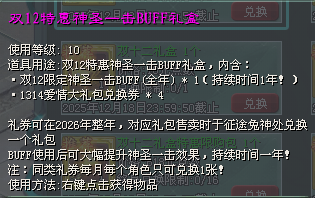 神圣一击BUFF礼盒,BUFF使用后可在365天内大幅提升神圣一击效果,额外赠送1314爱情大礼包兑换券*4