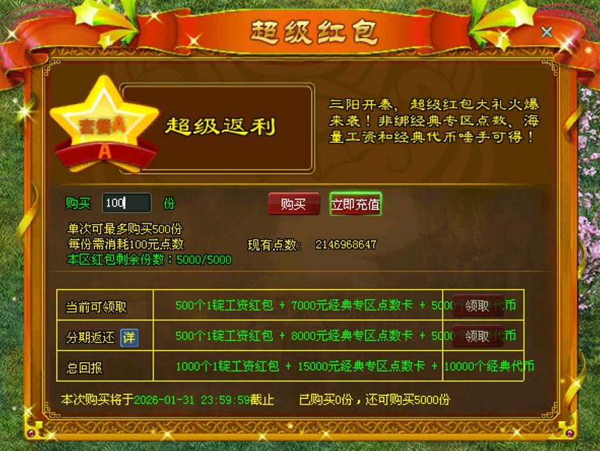 每100元点数可购买1份超级红包,购买后立返70经典版点数卡+50元经典版代币+5锭工资!次月1日一次性返还80元非绑定经典版点数+50元经典版代币+5D工资。