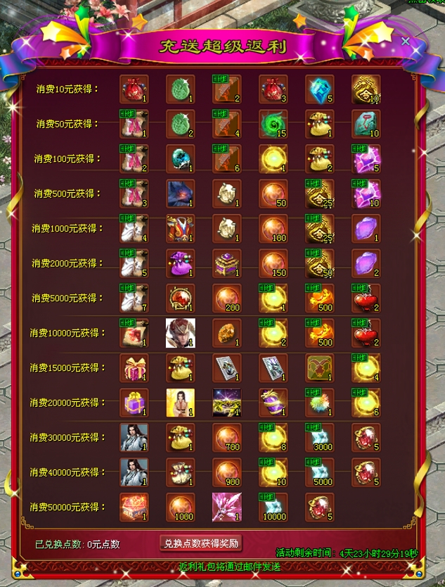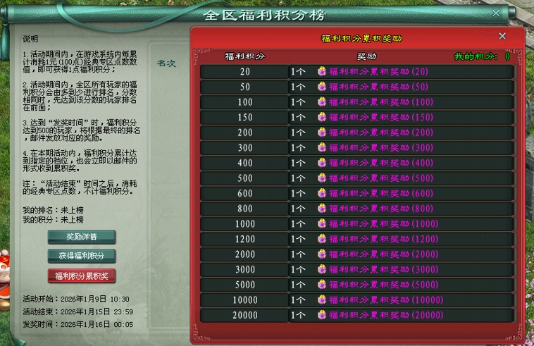 活动期间,游戏内每累计消耗1元(100点)经典版点数数值即可获得1点福利积分,达到指定积分、活动结束后根据积分排名,都可获得超值奖励!