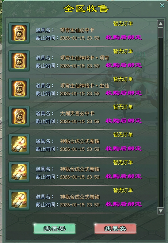 大闹天宫限时神将卡等道具均可通过全区收售进行收购,通过非绑经典专区点数卡交易,珍稀道具不再局限于本区,让交易更自由!