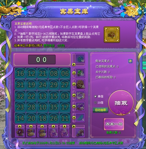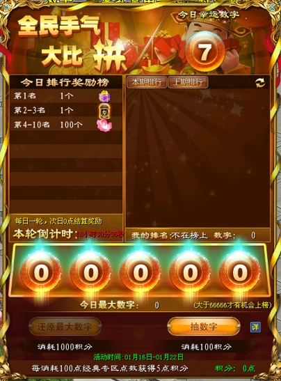 玩家每消耗100点经典版点数可获得5点活动积分,使用积分进行抽奖,从个位开始计算,与当日幸运数字相同时将获得三生三世花奖励,与当日幸运数字相同越多获得的奖励越多。