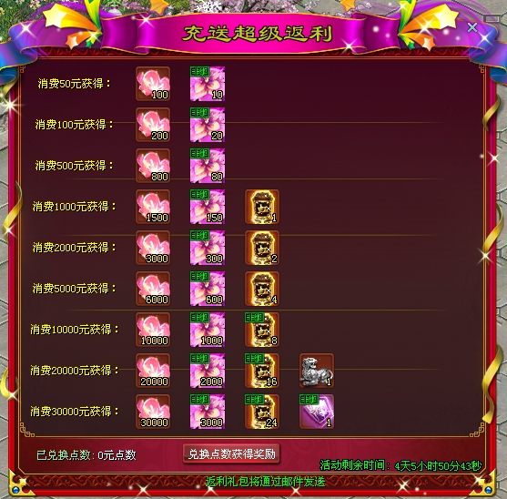 消费指定金额获取各样好礼!大量珍稀奖励免费送,买得越多送的越多,千万不要错过!