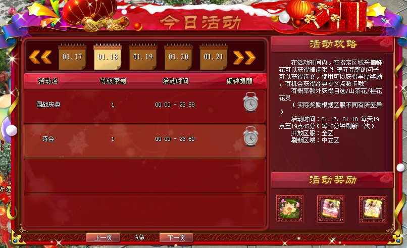 活动期间,每天19:00-19:45,在中立区将会出现一大片“玫瑰花丛”,玩家通过摘玫瑰可随机获得诗文的上下句(不绑定,可交易),凑齐同一篇诗文的上下句即可合成完整的诗文(右键点击合成),使用诗书即可随机获得诗会专属奖励!更有机会获得经典专区点数卡!
