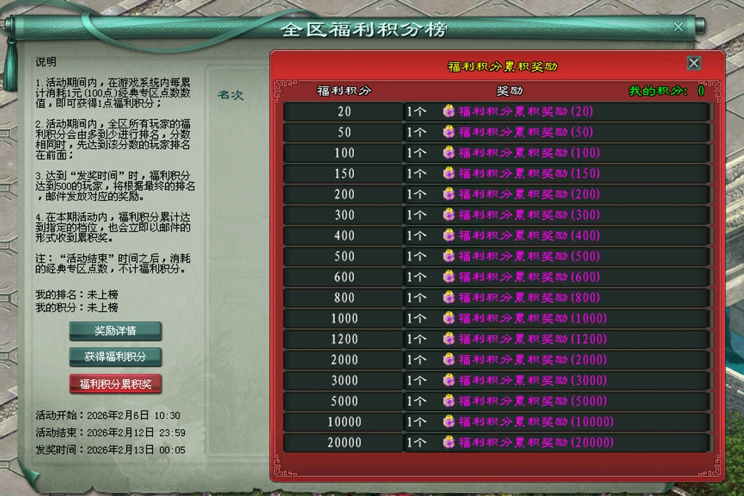 活动期间,游戏内每累计消耗1元(100点)经典版点数数值即可获得1点福利积分,达到指定积分、活动结束后根据积分排名,都可获得超值奖励!