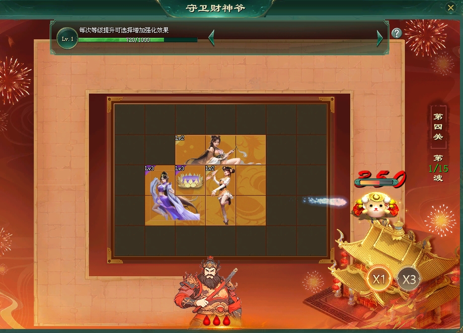 妖魔入侵,将军将和三国武将共同守卫财神。三国武将各有不同的战斗技能、所占格数。巧妙布局,严守防线!点击【奖励大厅-守卫财神爷】金色按钮,打开游戏界面,体验塔防无穷乐趣!