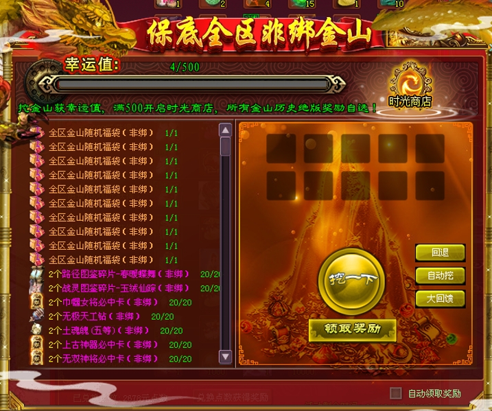 参与非绑金山有机会获得非绑全区金山随机福袋!每参与1次金山可累积1点幸运值,提升橙色大奖几率,如累积满500次未获得,可直接进入时光商店,如500幸运值内获得橙色大奖则幸运值清空,保底金山,保你中大奖!新春期间奖励新增路径图鉴碎片·春暖蝶舞!