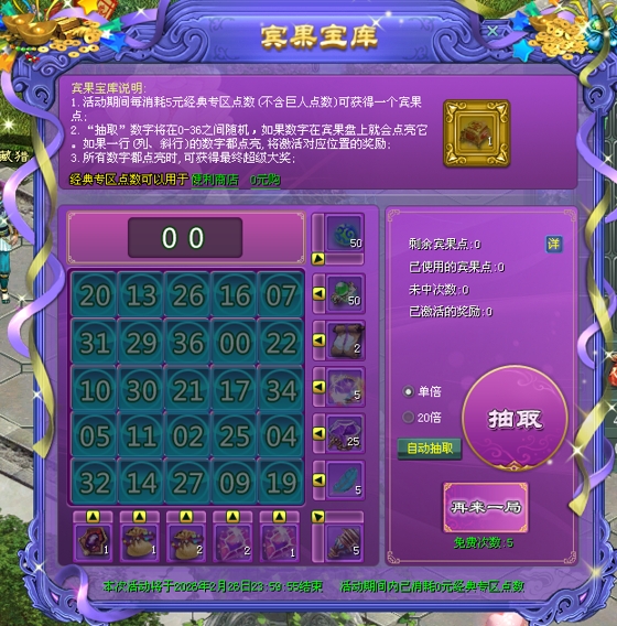 玩家每消耗100点经典版点数可获得5点活动积分,使用积分进行抽奖,从个位开始计算,与当日幸运数字相同时将获得三生三世花奖励,与当日幸运数字相同越多获得的奖励越多。