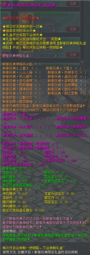 新春庆典限定神秘礼盒,内含新春庆典神将卡、新春庆典限定图鉴·新春庆典套装系列!新春庆典卡升级100%成功,满级可以获得千万攻防血!每日可无消耗开启一次,之后开启消耗1把钥匙,同时获得3个奖励!绝对超值,切勿错过!
