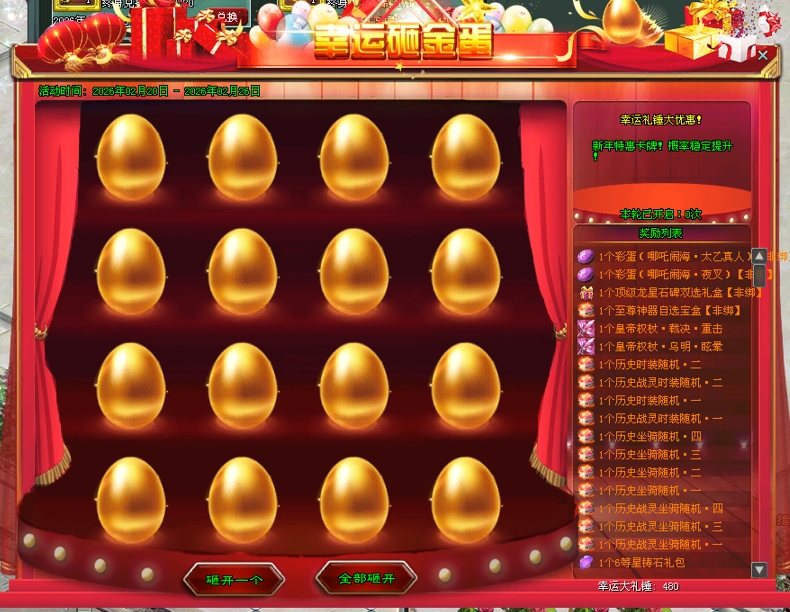 大礼锤砸金蛋,砸出超值豪礼!活动奖励含全新彩蛋(哪吒闹海·太乙真人)、彩蛋(哪吒闹海·夜叉)、顶级龙星石碑双选礼盒、至尊神器自选宝盒等珍稀奖励,机会难得,千万不要错过!