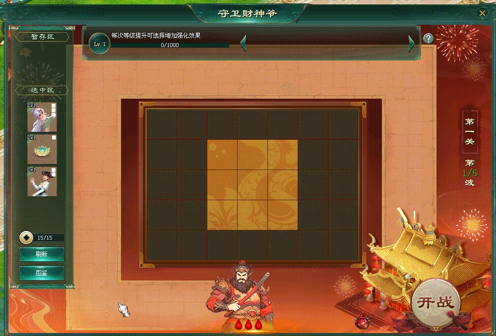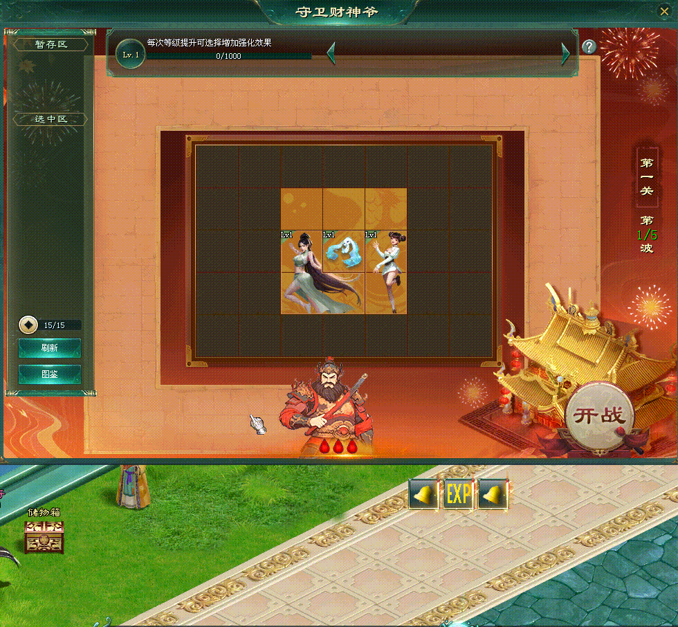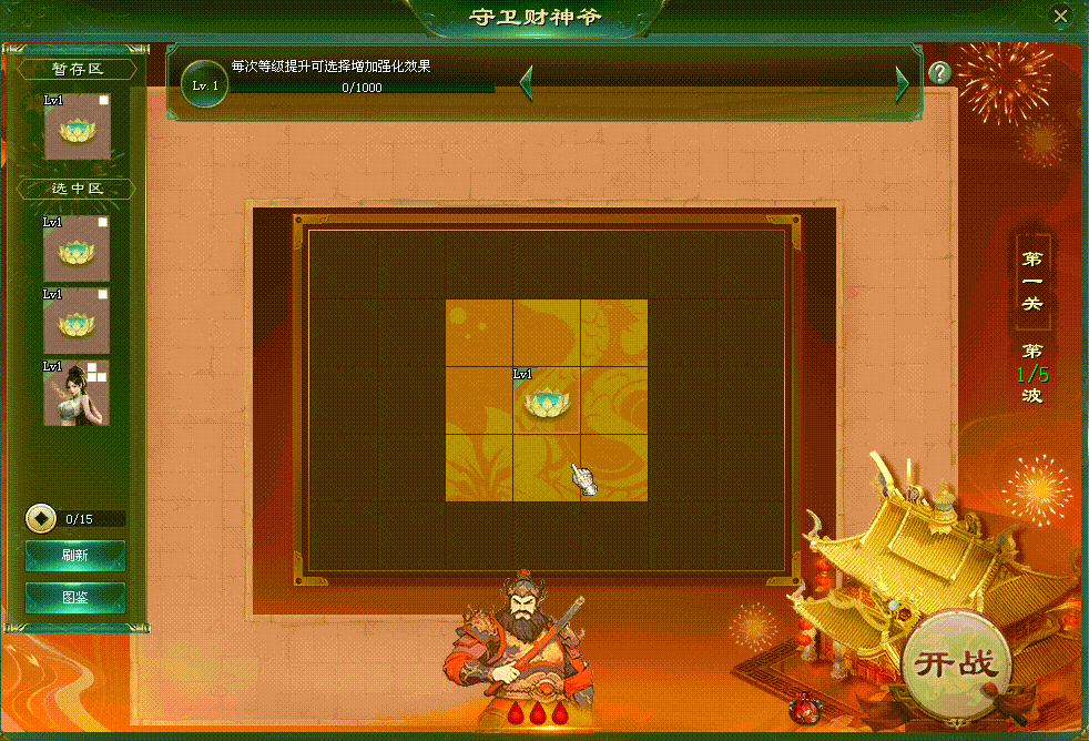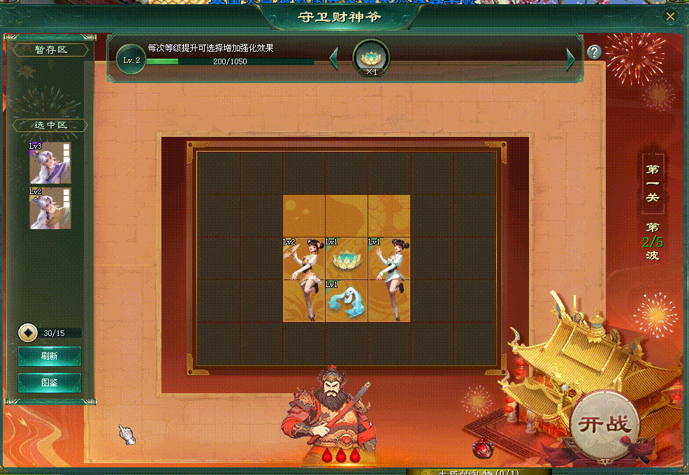 2. 刷新武将:点击“刷新”,花“财神通宝”就能刷出新的武将和格子。而且拖到左上角暂存区的武将不会被刷新,巧妙利用这个,能帮咱们凑出更强的阵容。