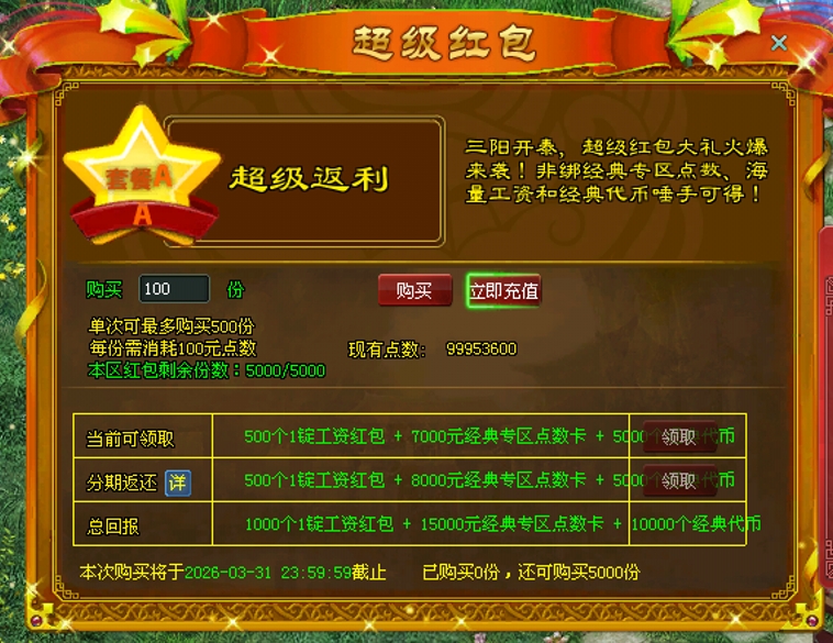 每100元点数可购买1份超级红包,购买后立返70经典版点数卡+50元经典版代币+5锭工资!次月1日一次性返还80元非绑定经典版点数+50元经典版代币+5D工资。