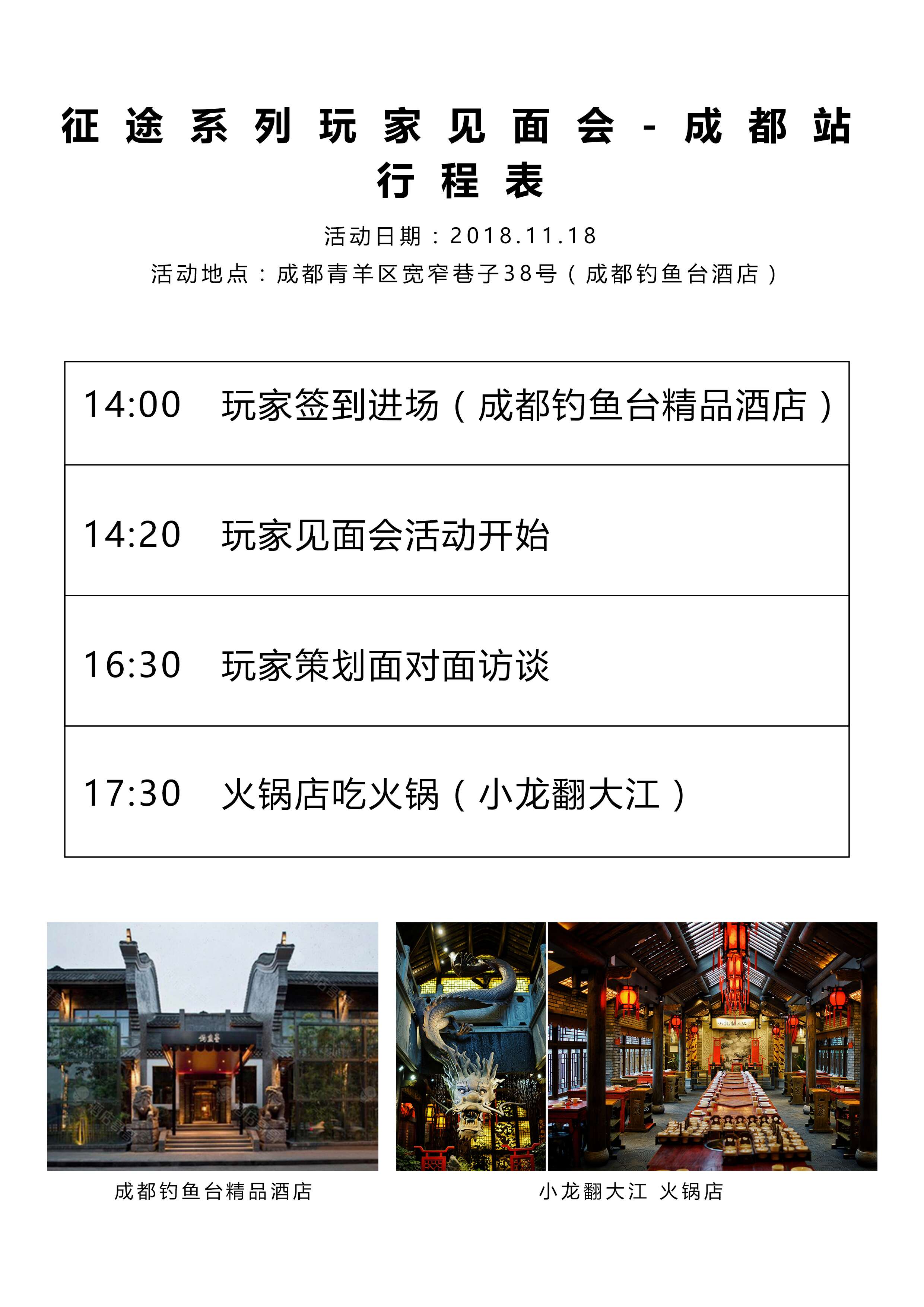 ■17:30 前往“小龙翻大江”火锅店聚餐,一起品尝成都特色美味火锅,玩家与研发团队成员喜乐融融畅聊游戏、笑谈人生!